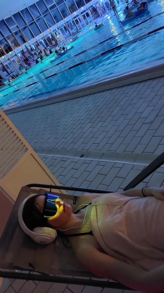 Lors de l’une de ces soirées, j’ai eu l’occasion de proposer des séances de luminothérapie, une expérience à la fois apaisante et revitalisante. Autour du bassin, les jeux de lumière douce créaient une atmosphère cocooning propice au lâcher-prise. La luminothérapie, utilisée pour rééquilibrer l’humeur et apaiser les tensions saisonnières, révélait tout son potentiel dans ce cadre aquatique et feutré. Les couleurs diffuses invitaient à la relaxation profonde, aidant chacun à retrouver énergie et calme intérieur.