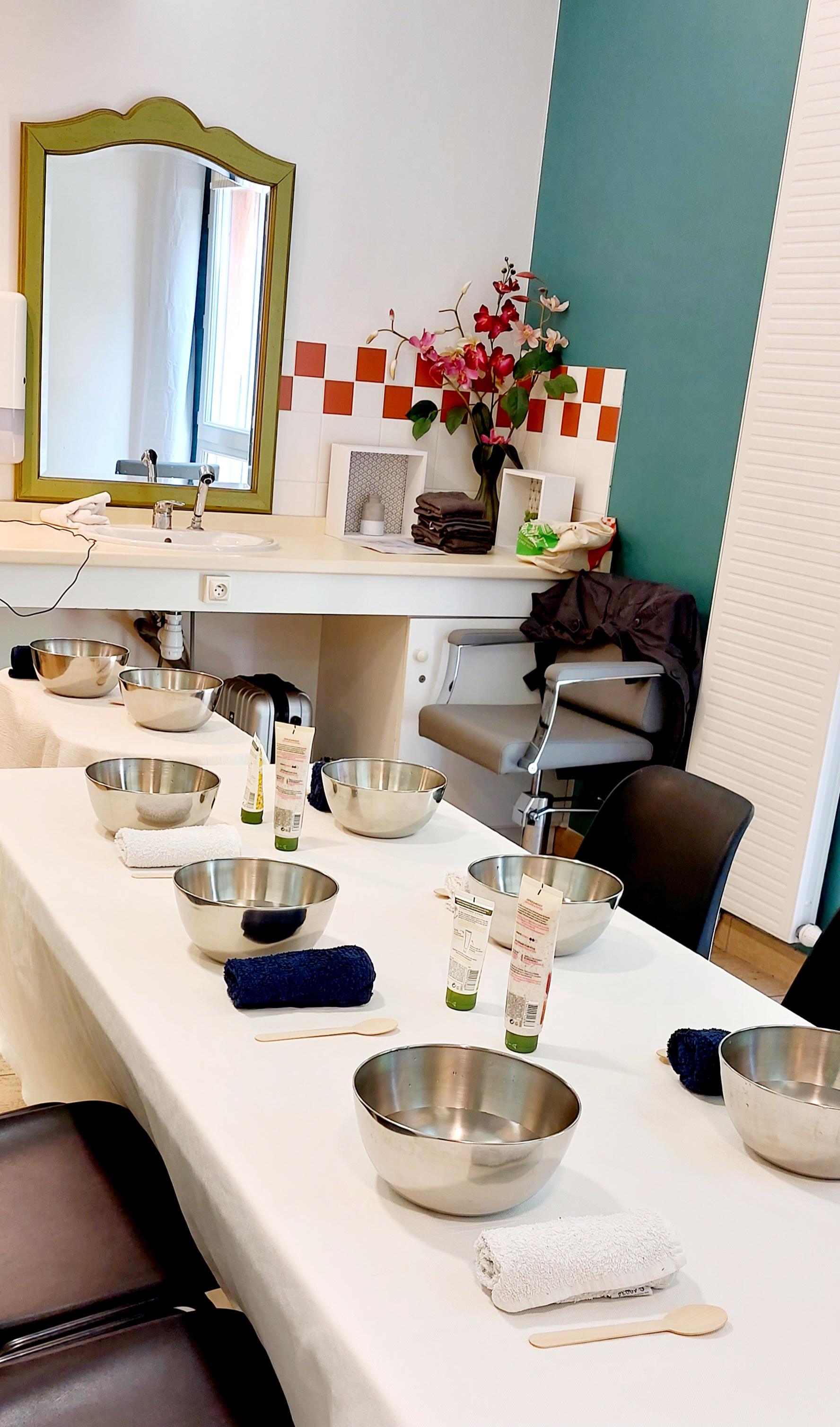 Pour les ateliers collectifs une salle avec un point d’eau pouvant accueillir tous les participants avec chaises et tables est essentiel.